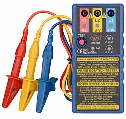 ● Indicates phase rotation. ● Indicates phase presence. ● Indicates motor rotation/wiring. ● Indicates battery status. ● Phase rotation and motor rotation indication works from as low as 1Vac. ● Small, rugged enclosure. ● Color coded test leads. ● Phase presence indication from as low as 100 Vac. ● Very low consumption. ● Fused. ● Lightweight, robust and compact. ● Works from 2 Hz to 400 Hz Sine.