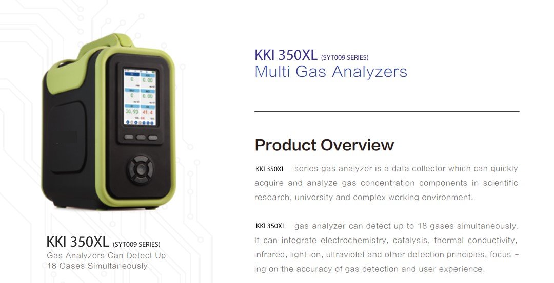 KKI 350XL (SYT009 series) gas analyzer can detect up to 18 gases simultaneously. It can integrate electrochemistry, catalysis, thermal conductivity, infrared, light ion, ultraviolet and other detection principles, focusing on the accuracy of gas detection and user experience.