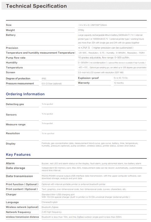 -20℃~+50℃, Optional gas sampling gun, can detect up to1200 degrees gas concentration |